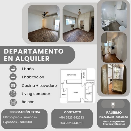 Está en la zona del Parque Botánico. Se encuentra ubicado en calle Gurruchaga entre Güemes y Charcas. Cuenta con dos ambientes, en un último piso, muy luminoso.