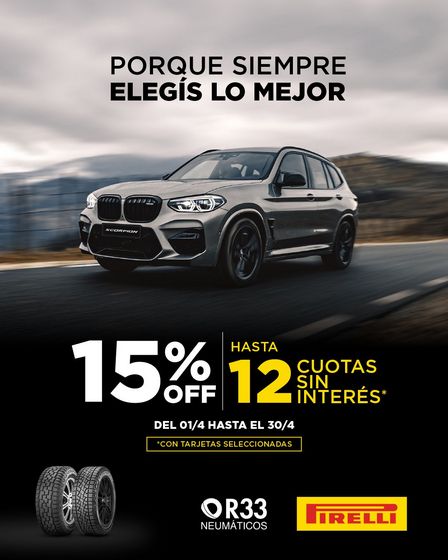 Hay un 15 por ciento off, en neumáticos SUV, y hasta 12 cuotas sin interés con tarjetas seleccionadas que rige hasta el 30 de abril de 2025.