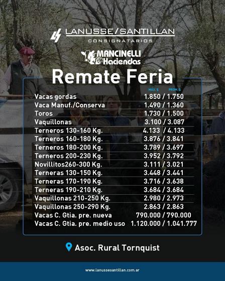 Lanusse Santillán Consignatarios detalló los precios de su remate en Tornquist