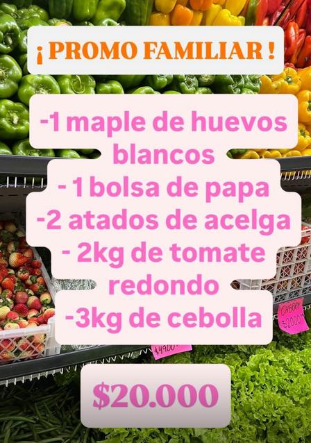 Disfrutá, en su salón de Avenida Carlos Gardel esquina 9 de Julio de Pigüé, por 20.000 pesos tiene 3 kilos de cebolla, 2 kilo de tomate redondo, 2 atados de acelga, 1 bolsa de papas, y 1 maple de huevos.