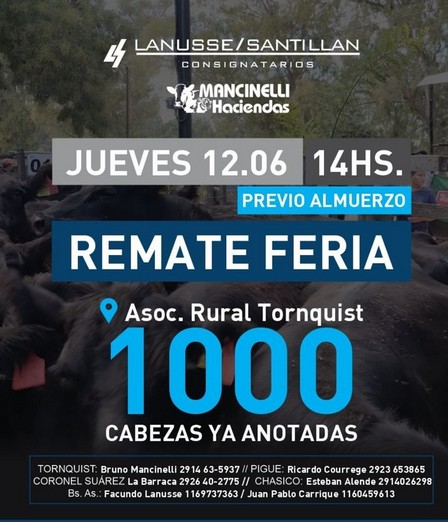 Es posible anotar consignaciones a través de los contactos con Ricardo Courrege, en Pigüé y la zona, a través 2923 65 38 65, en Buenos Aires con Juan Pablo Carrique al 11 60 45 96 13, con Facundo Lanusse al 11 69 73 73 63, o ingresando a www.lanussesantillan.com.ar