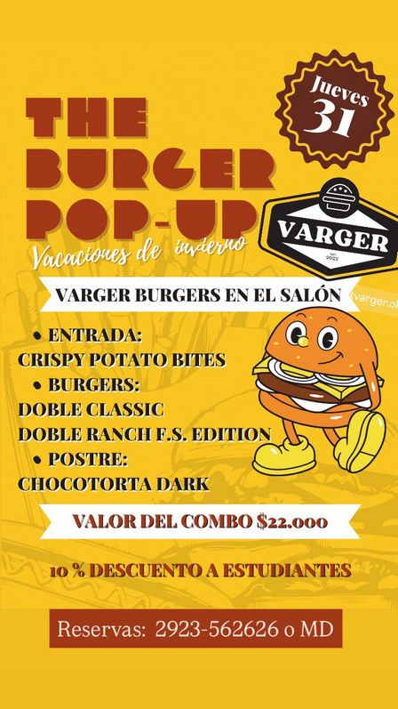 En Bernardo de Irigoyen 431 de Pigüé, por 22.000 pesos, la entrada incluirá crispy potato bites, las burgers serán doble classic / doble ranch FS Edition, y el postre una chocotorta dark, con descuento del 10 por ciento a estudiantes.