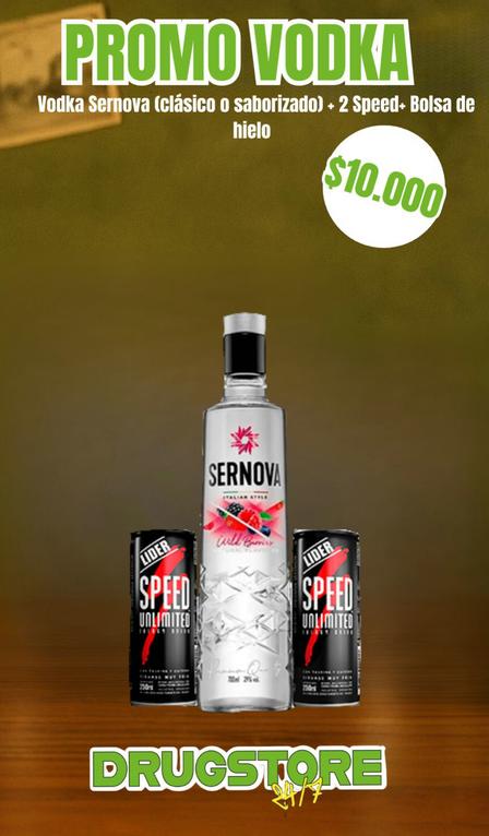 El Vodka Sernova (clásico o saborizado) más 2 Speed más una bolsa de hielo cuesta 10.000 pesos, 1 cerveza Corona de 710 centímetros cúbicos más 2 Coronas de 370 salen 8.000 pesos, y las 2 cervezas Brahma de 1 litro están a 6.000 pesos.