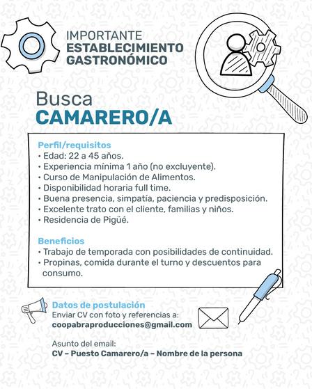 Seleccionan Ayudante de cocina, Camarero y Barman en la ciudad.