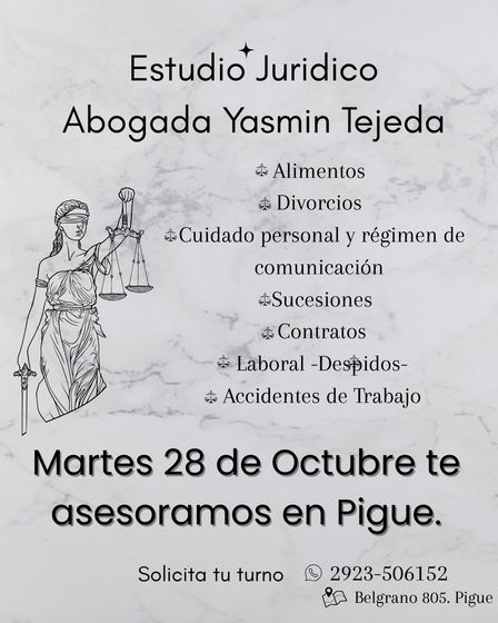 Este martes, 28 de octubre de 2025, la Abogada Yasmin Tejeda tiene agenda abierta para turnos en Pigüé recibiendo consultas a través del 2923 50 61 52 o bien en Belgrano 805.