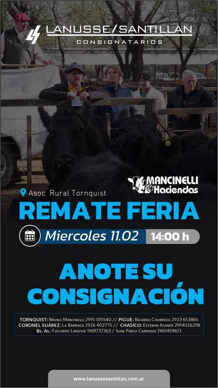 Por consultas, para consignar lotes, es posible comunicarse, en Pigüé y la zona, con Ricardo Courrege, al 2923 65 38 65, mientras que, en Buenos Aires, con Juan Pablo Carrirque al 11 60 45 96 13, y con Facundo Lanusse al 11 69 73 73 63, o vía www.lanussesantillan.com.ar
