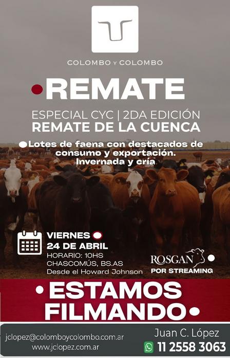 Juan C. López, y la Casa Consignataria, ya filma para el Remate Rosgan del 24 de abril, Especial Colombo y Colombo, donde saldrán a venta lotes de invernada, gordo de exportación y consumo, abriéndose ya la posibilidad de anotar las consignaciones.