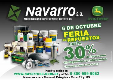En Pigüé es noticia al mediodía Navarro SA está anunciando la pre venta con la posibilidad de solicitar presupuesto para obtener un 30 por ciento de descuento en repuestos y lubricantes.