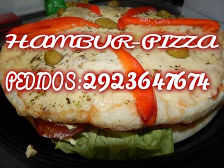 El local de Martínez de Hoz 18 de Pigüé promociona 'La sensación del momento: las hamburpizzas', sus pizzas en las latas mixtas y los panchuques.