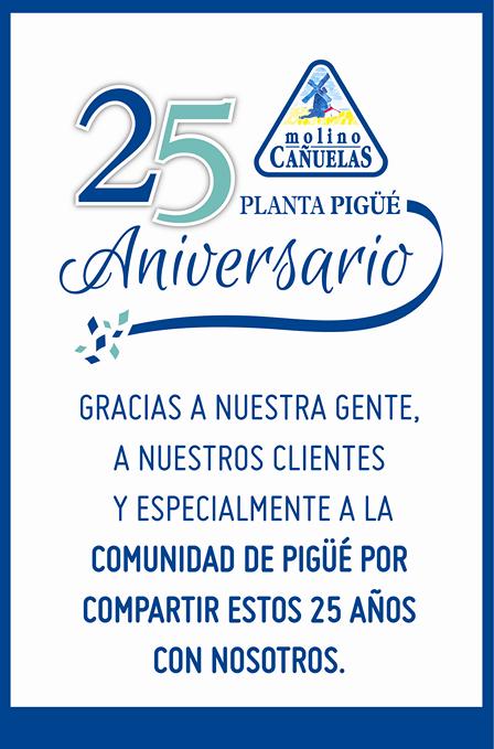 Molino Cañuelas expresó 'Gracias a nuestra gente, a nuestros clientes, y especialmente a la comunidad de Pigüé por compartir estos 25 años con nosotros'.