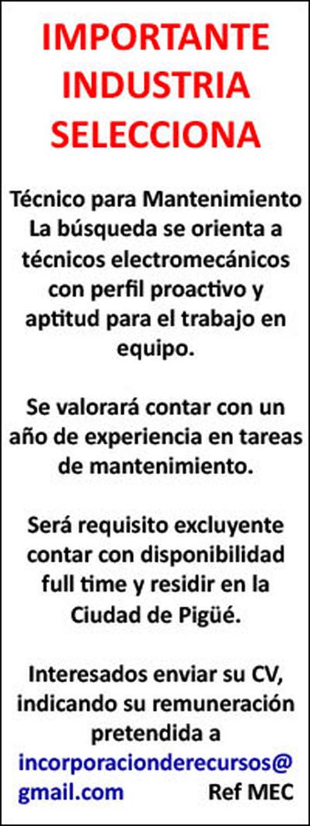 Una industria local busca técnico para mantenimiento