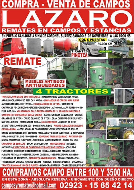 Saldrán a la venta cuatro tractores, silos, carretones, carros, repuestos nuevos, casillas, acoplados, transportadores de rollos, herramientas y maquinarias agrícolas, tirantes de pinotea, y un Gol 5 puertas con 55 mil kilómetros.
