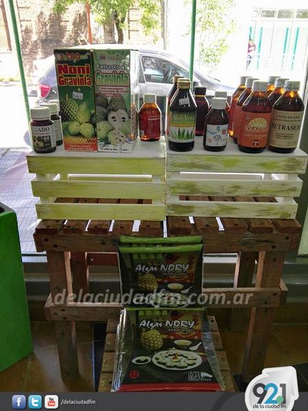 En el local hay graviola,, aceite de chía, aceite de lino, aceite de sésamo, aloe vera, y sésamo.
