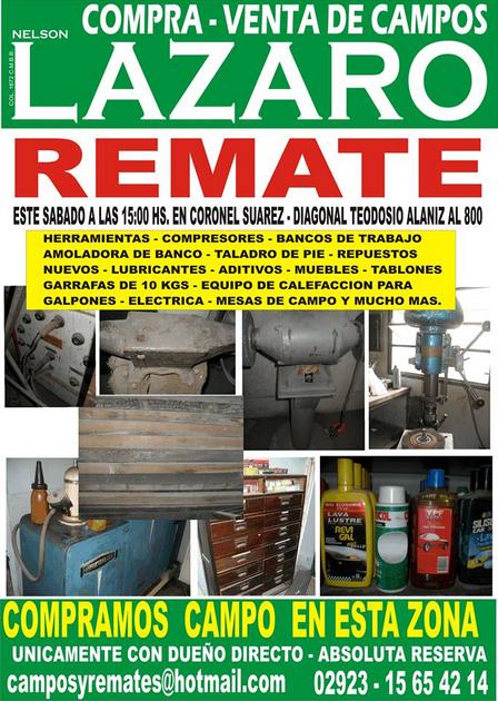 Herramientas, compresores, bancos de trabajo, amoladoras, taladros de pie, repuestos nuevos, lubricantes, muebles, mesas de campo, y un equpo de calefacción para galpones saldrán a subasta este sábado, a las 15.00 horas, en Diagonal Teodosio Alaniz al 800 de Coronel Suárez.