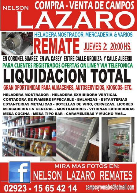 Esta noche, desde las 20.00 horas, en Coronel Suárez, saldrá a la venta una heladera mostrador, estanterías, cortadoras de fiambre, balanzas, y mercaderías varias.