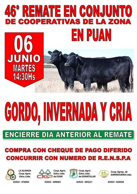 La Alianza y las cooperativas de Puan, Darregueira y Espartillar harán el cuadragésimo sexto remate conjunto de hacienda en Puan, el martes 6 de junio, a las 14.30 horas.
