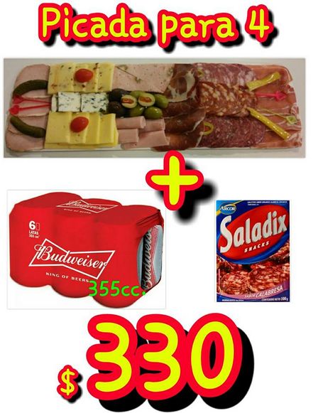 La Tablita tiene 6 latas de Budweiser de 330 centímetros cúbicos, más un paquete de Saladix, más una picada a ese precio.