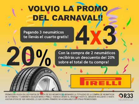 En R33 Neumáticos rige la propuesta del 4 x 3, ya que, comprando 3 neumáticos el cuarto es gratis.