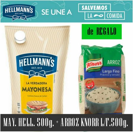 En el Autoservicio de La Alianza la mayonesa Hellmanss de 500 gramos viene con el obsequio de Arroz Knorr de 500 gramos.