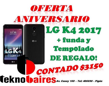 El teléfono LG K4 más funda y templado tiene un valor de 3.150 pesos en el local de Avenida Casey 160 de Pigüé.