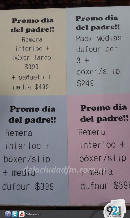 En el local de Avenida Casey 110 de la ciudad hay una remera interloc más un boxer largo, más un pañuela, más un par de medias, a 499 pesos, o un pack de medias Dufour de 3 pares con un boxer o slip a 249 pesos.