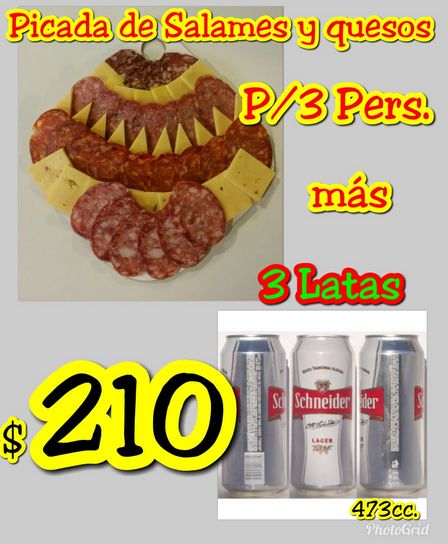 La picada de salames y quesos para tres personas con tres latas de cerveza Schneider de 473 centímetros cúbicos cuesta 210 pesos.