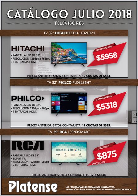Hay un TV Led Hitachi de 32 pulgadas a 5.958 pesos contado efectivo, un colchón y Somier Piero Corona Real de dos plazas... contado efectivo a 9.456 pesos o 12 cuotas de 985 pesos, un juego de mesa de pino y 6 sillas en 12 pagos de 1.766 pesos, y una Heladera Whirpool en 12 cuotas de 3.529 pesos.
