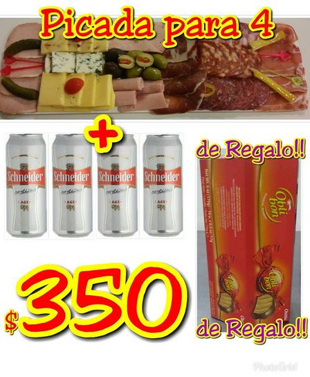 La Tablita tiene 4 latas de cerveza Schneider más una picada para cuatro personas con una caja de bombones de regalo.