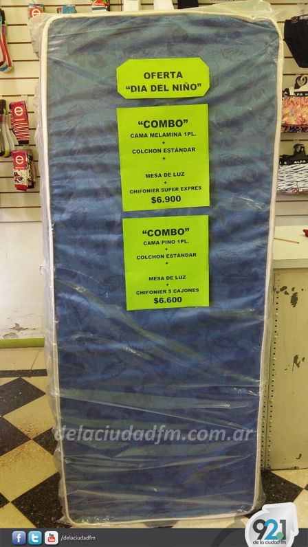 El combo de oferta está disponible con una cama de pino más un colchón, más una mesa de luz, y un chifonier con cajones a 6.600 pesos.