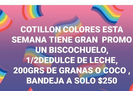 Cotillón Colores, por 250 pesos, tiene un biscochuelo, medio kilo de dulce de leche, y 200 gramos de granas o coco.