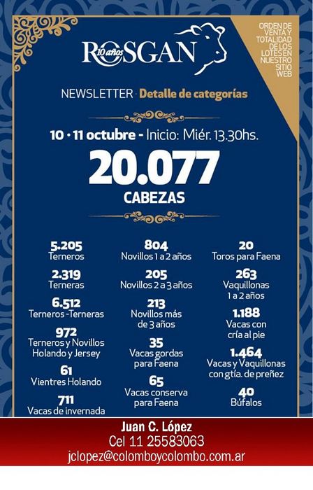El remate Rosgan10º Aniversario tendrá 20.077 cabezas comenzando este miércoles a las 13:30 horas.