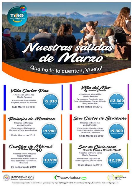 Tigo Viajes programa salidas para San Carlos de Bariloche, Chile, Capillas de Mármol, Viña del Mar, Mendoza, y Villa Carlos Paz.