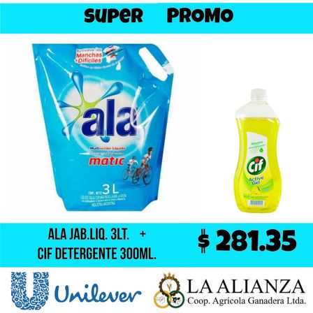 El jabón líquido Ala, de tres litros, más el detergente CIF de trescientos mililitros, cuesta 281.35 pesos.