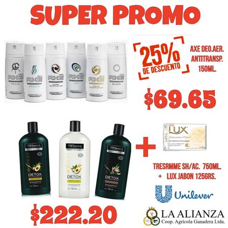 En La Alianza por 222.20 pesos es posible encontrar shampoo o acondicionador TresEmme de 750 mililitros más un jabón Lux de 125 gramos.