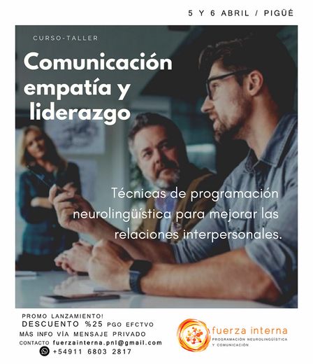 El mensaje dice "Si buscás capacitarte, si sos profesional, docente, comerciante, estudiante, o estás pensando en sumar más conocimientos para tu trabajo diario consultanos. Curso Taller de Comunicación, empatía y liderazgo. 5 y 6 de abril. Técnicas de programación neurolingüistíca para mejorar las relaciones interpersonales. Reconocido por la Asociación Argentina de PNL. Promo lanzamiento con un 25 por ciento de descuento.