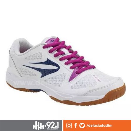 La línea de voley y handball Topper cuenta con suela caramelo, es de color blanca, y tiene cordones fucsia.