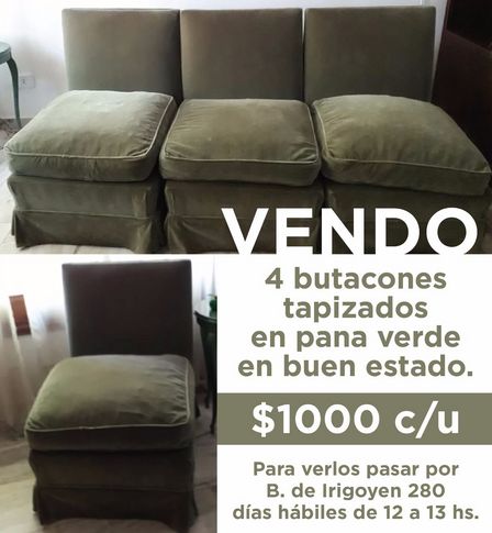 Venden cuatro butacones tapizados, en pana verde, en buen estado A 1.000 pesos cada uno.