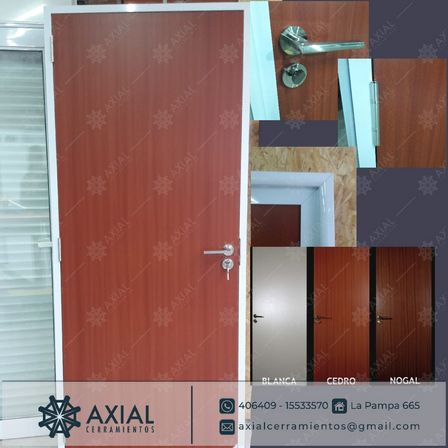 Puerta de madera maciza, enchapada en PVC, sin requerir de pintura, con marco de aluminio, herrajes de acero, cerradura de alta calidad, llave y traba interior.