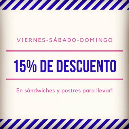 El local de Avenida Casey 343 de la ciudad cuenta con un quince por ciento de rebaja para los días viernes, sábado, y domingo en sándwiches y postres para llevar.