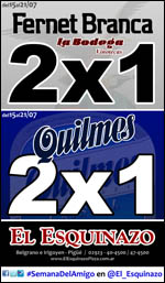 El 2 x 1 es tanto en cerveza Quilmes como en Fernet Branca, hasta el domingo, en El Esquinazo.
