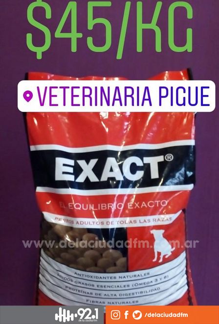 Veterinaria Pigüé tiene el kilo de balanceado para perros, adultos de todas las edades, de la marca Exact, a 45 pesos.