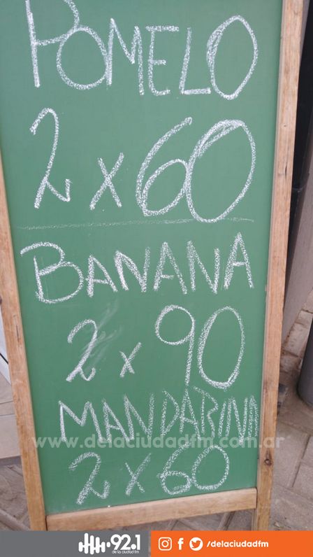 El local de calle 9 de Julio esquina Avenida Carlos Gardel de la ciudad tiene dos kilos de mandarinas a 60 pesos, y dos kilos de bananas a 90 pesos.