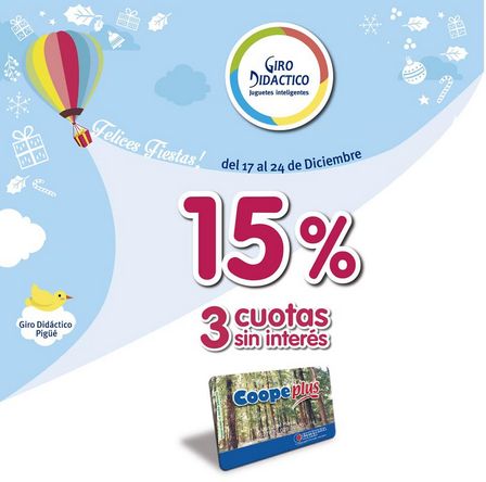 Desde el martes 17 de diciembre estará vigente, hasta el 24 del mismo mes, un descuento del quince por ciento y tres cuotas sin interés con tarjeta Coopeplus.