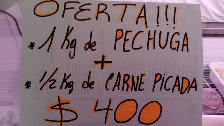 Un kilo de pechuga más medio kilo de carne picada cuestan 400 pesos en el local de La Pampa esquina Lavalle.