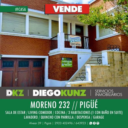 Diego Kunz Servicios Inmobiliarios ofrece a la venta una propiedad en calle Moreno 232, ubicada en pleno centro de Pigüé.