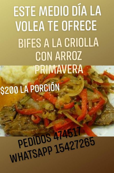 La Volea Sport Bar cocina bifes a la criolla tomando reservas al 47 45 17 o bien al 2923 42 72 65.