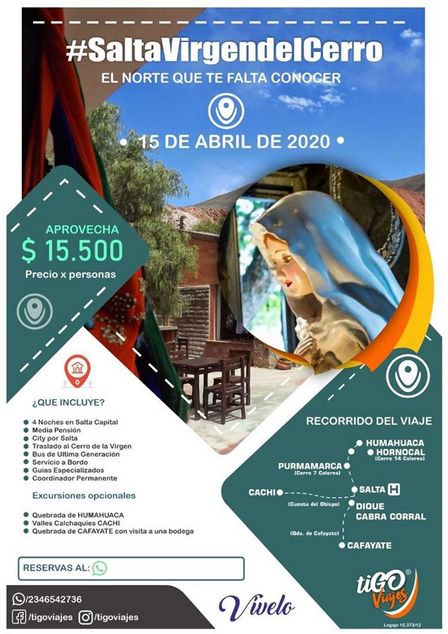En abril la salida está programada para el día 15 con destino la Virgen del Cerro de Salta.