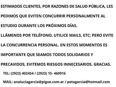 Llámenos, utilice mails, etcétera; pero evite la concurrencia personal. En estos momentos es importante que seamos todos solidarios y precavidos, evitemos riesgos innecesarios".