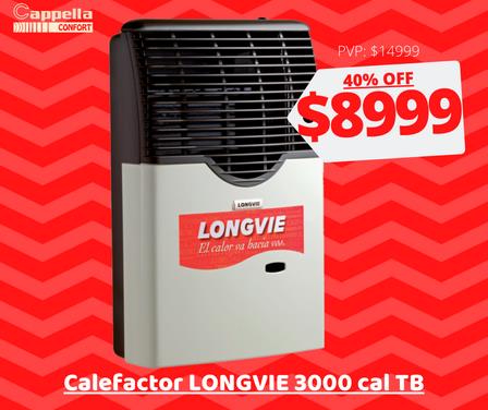 Al 2923 56 34 84 se puede solicitar el envío a domicilio para este calefactor Longvie 3.000 calorías TB por 8.999 pesos.