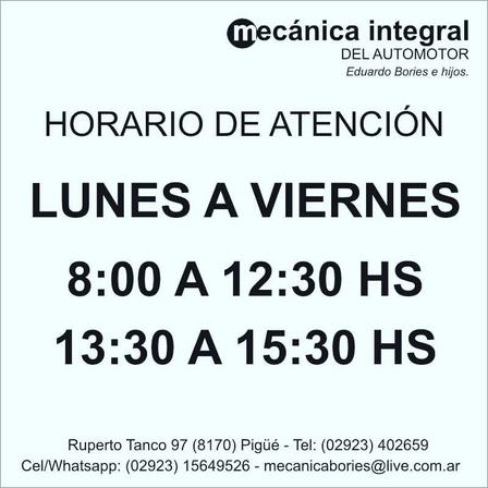 Mecánica Integral del Automotor de Eduardo Bories e Hijos trabaja de lunes a viernes, de 8.00 a 12.30 horas, y de 13.30 a 15.30 horas.